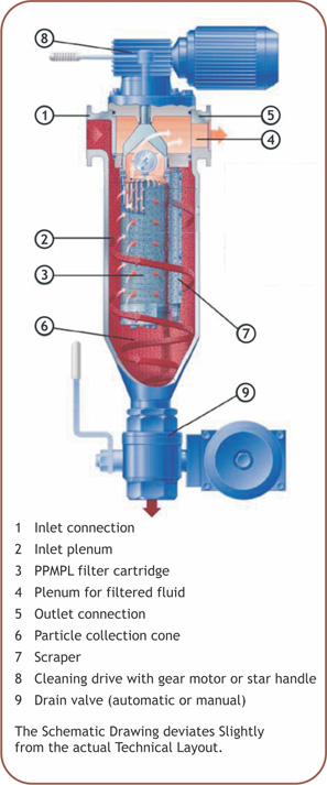- The filter is cleaned either when a preset differential pressure limit is reached or after a specified cycle time elapses. The PPMPL filter cartridge is rotated against scraper for this purpose. The special gap geometry of the filter cartridge guarantees efficient cleaning.